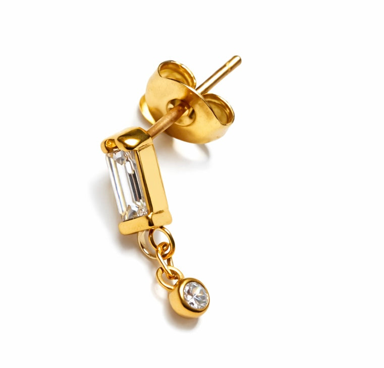 Élégante et minimaliste, cette boucle d’oreille en plaqué or se distingue par son zirconium taille baguette, sublimé par un pendentif délicat serti d’un zirconium rond. Le contraste des formes apporte une touche moderne et raffinée, tout en restant intemporel.