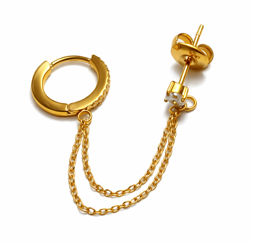 Audacieuse et raffinée, cette boucle d’oreille en plaqué or 3 microns joue avec les codes de la joaillerie contemporaine. Composée de deux anneaux délicats à porter sur deux trous, elle est reliée par une double chaîne fine qui apporte mouvement et élégance. Un zirconium discret vient sublimer l’ensemble avec une touche de lumière subtile.