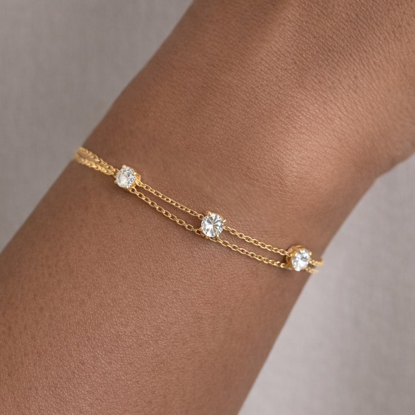 Raffiné et lumineux, ce bracelet en plaqué or 3 microns habille le poignet avec élégance. Composé de deux chaînes délicates et orné de trois zirconiums scintillants, il capte la lumière avec subtilité pour un éclat chic et intemporel. Une pièce précieuse, idéale à porter seule ou en accumulation.